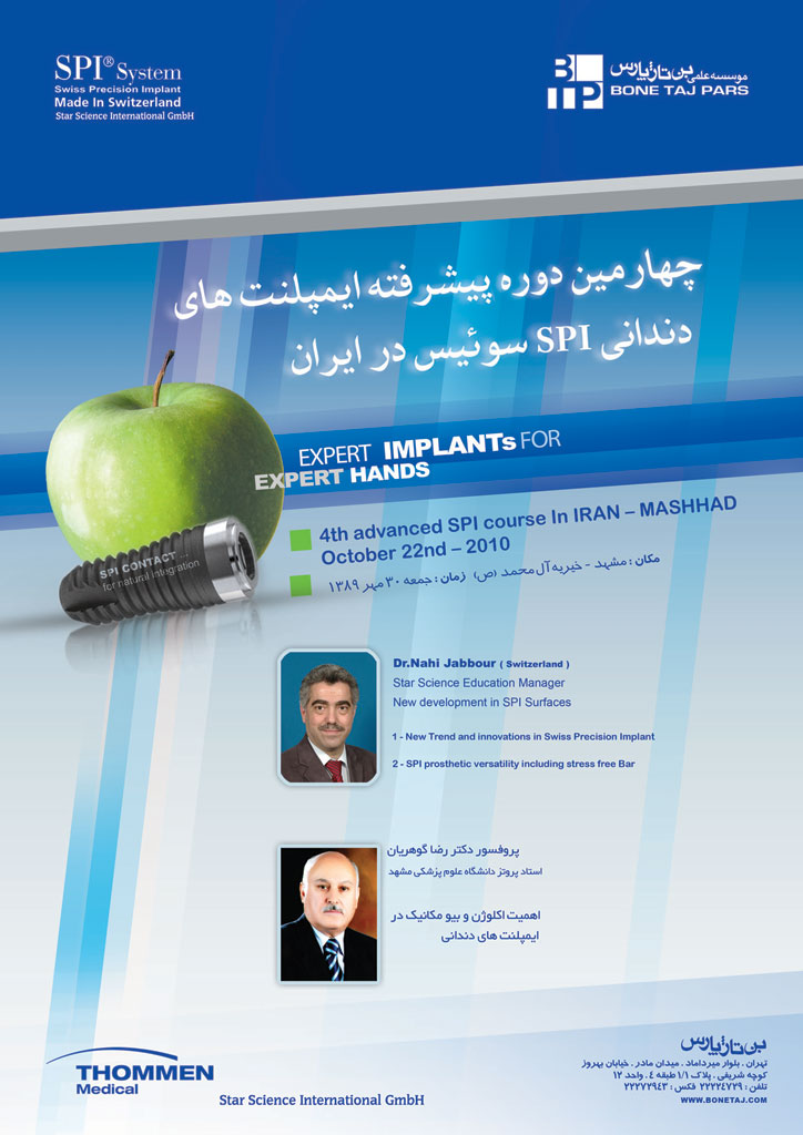 22 مرداد,1390 اخبار چهارمین دوره پیشرفته ایمپلنت دندانی SPI - مشهد محل برگزاري: مشهد تاريخ برگزازي: 30 مهر ماه 1389 قبلی بعدی