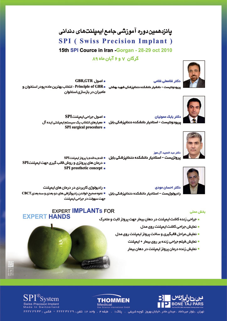 22 مرداد,1390 اخبار پانزدهمین همایش جامع ایمپلنتهای دندانی SPI - گرگان محل برگزاري: گرگان تاريخ برگزاري: 6 و 7 آبان ماه 1389 قبلی بعدی